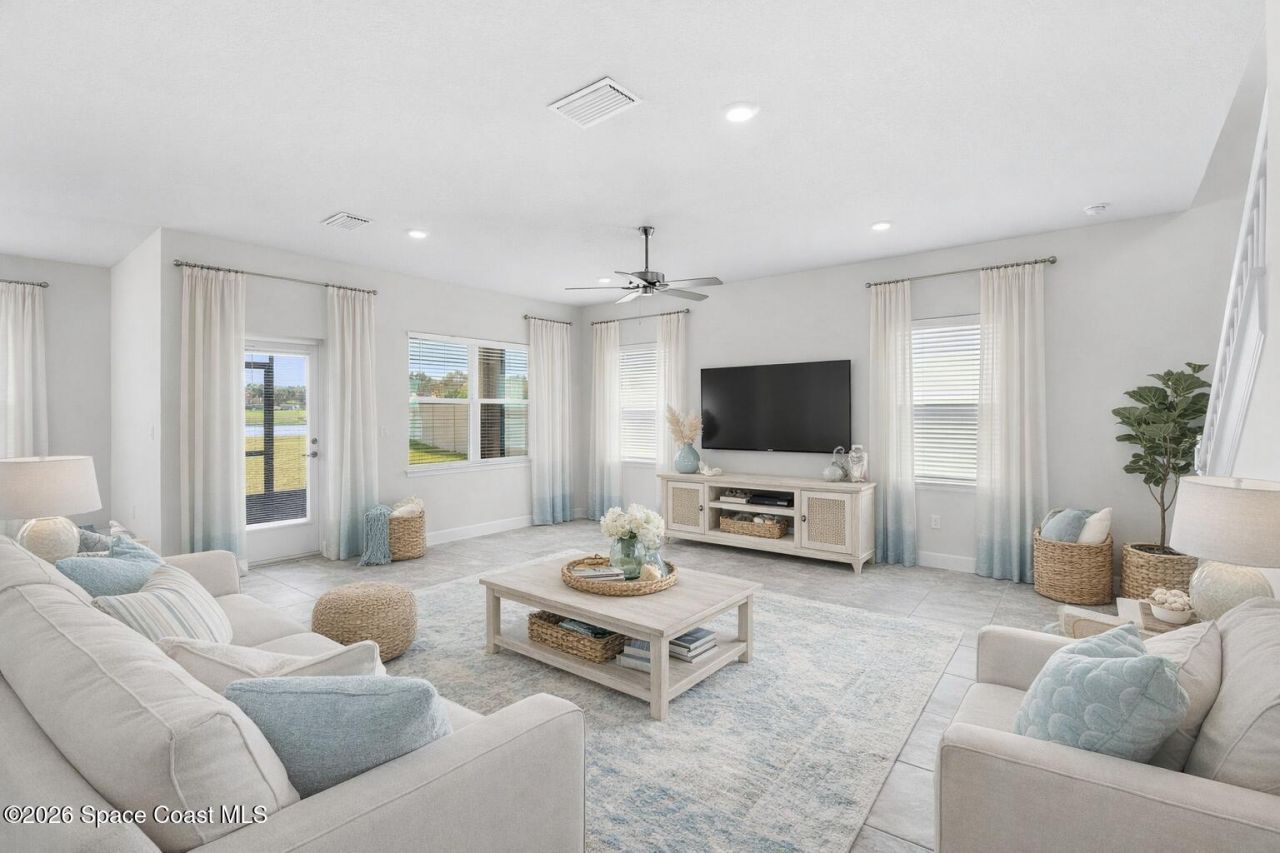 Lakefront home built in 2023 and priced under $400K. new construction--without the wait or the added upgrade costs. Situated on a premium waterfront lot in the Gardens at Waterstone, this two-story residence features over 2,100 square feet of thoughtfully designed living space with 4 bedrooms, 2.5 baths, and a spacious loft. The open-concept main level is finished with tile flooring throughout and seamlessly connects the kitchen, dining area, and great room--perfect for both everyday living and entertaining. The kitchen has already been enhanced beyond builder grade with a stylish tile backsplash, upgraded lighting, and ceiling fans installed throughout the home. Step outside to a screened lanai overlooking the peaceful lake, creating the perfect setting for morning coffee or evening relaxation. Upstairs youll find all four bedrooms, a centrally located laundry room, and a versatile loft that works beautifully as a study space! Additional features include accordion hurricane shutters for added storm protection and convenience. Located in a resort-style community offering a pool, tennis courts, pickleball, playground, and recreation areas, with easy access to I-95, shopping, dining, and the growing St. Johns Heritage Parkway corridor.Why wait months for a new build when this upgraded, lakefront home is ready today?