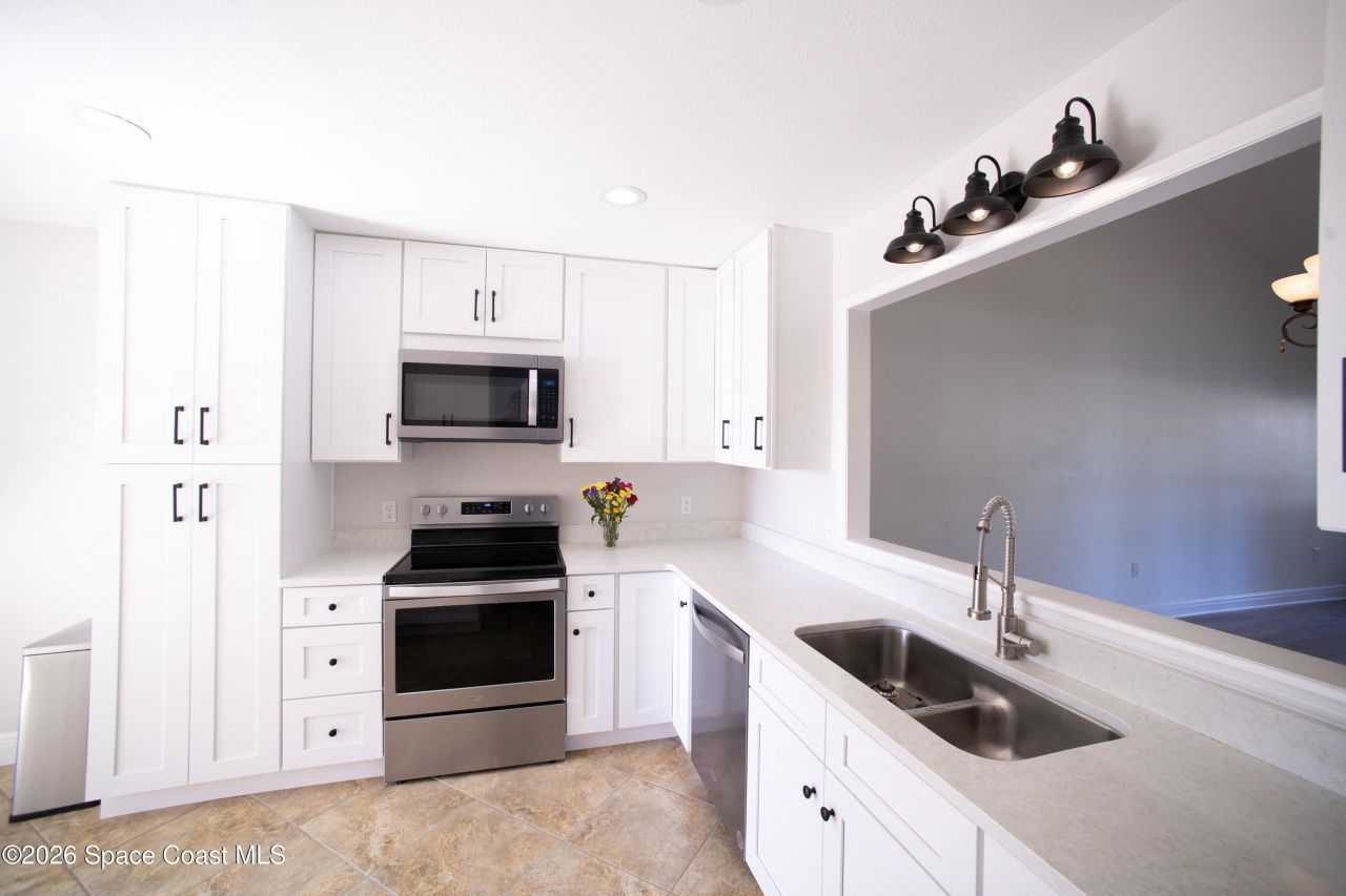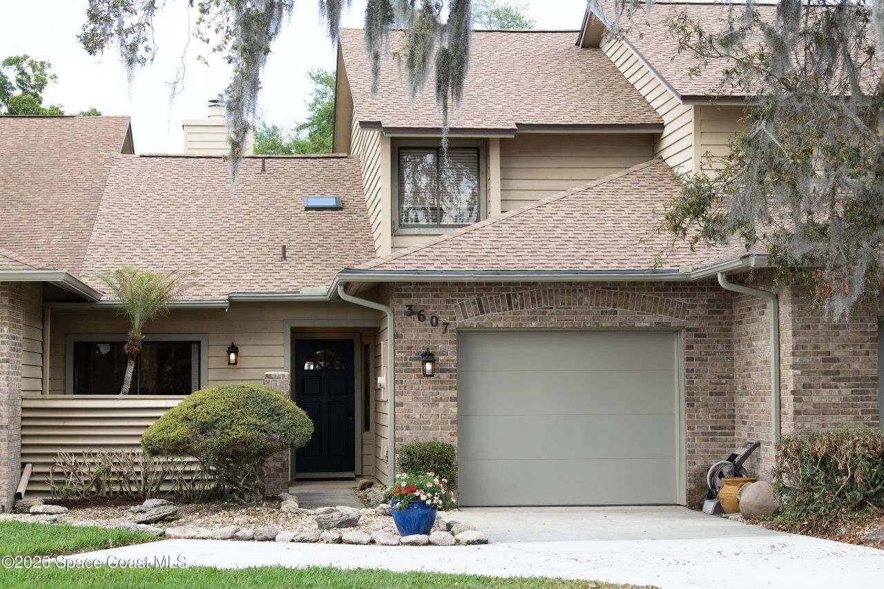 The search is over! Your new home awaits at 3607 Muirfield Drive located on the golf course (3rd hole) in the beautiful La Cita Golf & Country Club community. This home is a peaceful, spacious , two-story townhouse with 3 bedrooms and 2.5 baths. Remodeling includes a new roof (Oct 2025), fresh paint throughout, new water heater, electrical panel, kitchen cabinets, quartz countertops, living room flooring, and master bath vanity, tile flooring, and lighting. The kitchen pass-through connects with the dining/living room area making it perfect for entertaining. A natural stone, wood-burning fireplace and vaulted ceilings make for ideal hosting and cozy family evenings. Sunrises over the golf course provide for relaxing mornings in the sunroom. The large master bed/bath is located on the first floor, leaving the second floor bedrooms and bath for children or guests. View rocket launches and beautiful sunsets from the comfort of this Move-in-Ready hidden gem!