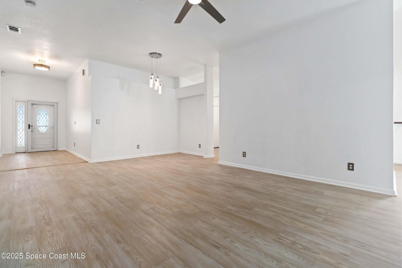 Step into this bright and open 4-bedroom, 2-bath home in the gated community of Brentwood Lakes. Spanning 1,805 square feet, the home features luxury vinyl flooring throughout and a spacious living room that flows seamlessly into the dining area and kitchen. The chef-ready kitchen offers stainless steel appliances, a modern backsplash, and ample counter and cabinet space. The primary suite serves as a comfortable retreat with vaulted ceilings, a walk-in closet, and an en suite bathroom featuring dual sinks, a soaking tub, and a walk-in shower. A separately remodeled bathroom adds a fresh, modern touch and is ideal for guests or secondary bedrooms. Thoughtful upgrades continue with a hurricane-rated front entry door and hurricane French doors at the rear, offering added peace of mind while filling the home with natural light and providing easy access to the backyard. An LG washer and dryer are included, adding everyday convenience. Outside, enjoy a generous backyard on just under a quarter-acre, offering plenty of space for entertaining, play, or future outdoor enhancements. The home also boasts a brand-new roof (2025). Residents enjoy community amenities including a pool and playground, along with convenient access to parks, shopping, highways, and the beaches. This move-in-ready home brings together comfort, style, and location in one inviting package. Mortgage savings may be available for buyers of this listing.