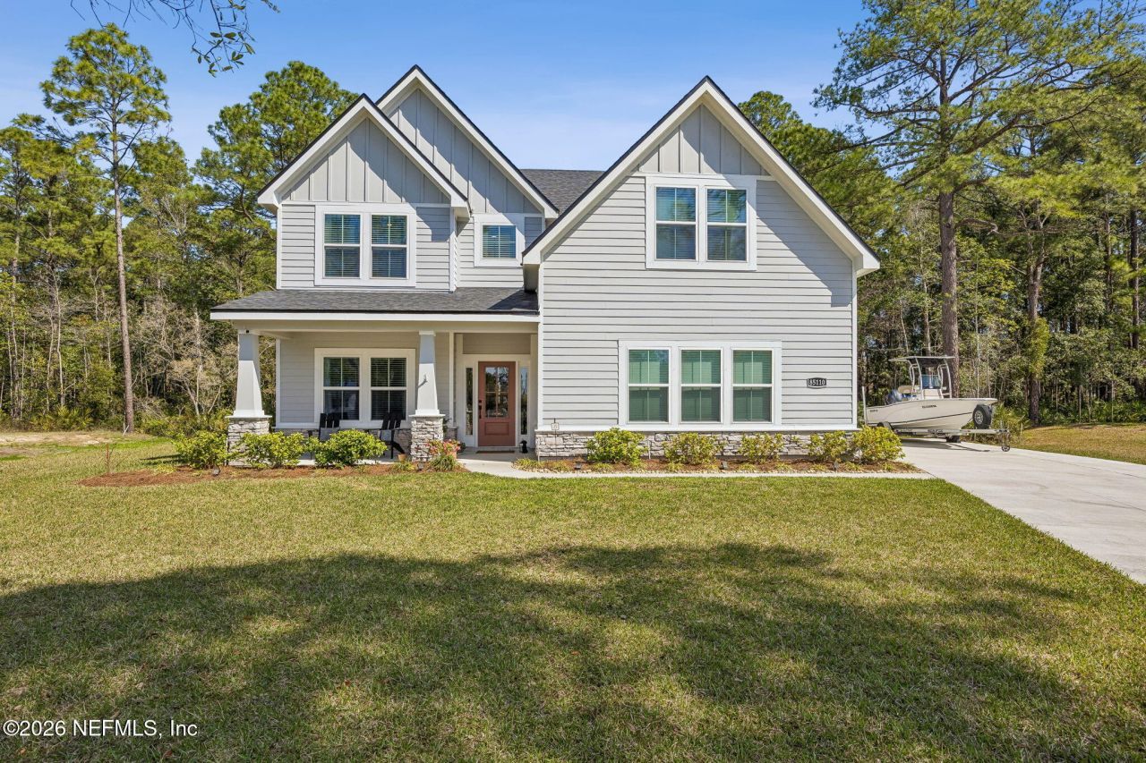 Nestled on a private 1/2-acre wooded lot in a quiet gated community, this beautifully upgraded home blends Old Florida charm w/modern comfort. Deer roam freely, and a tranquil fishing pond sits just out front. The gourmet chef's kitchen features quartz countertops, SS appliances, double ovens, & an induction cooktop, opening seamlessly to the family room with a custom shiplap accent wall, perfect for entertaining. Luxury details include LVP flooring, oak staircase, custom crown molding, & designer window treatments throughout. The primary suite offers a spa-inspired bath, while additional bedrooms include a private en-suite & a shared Jack & Jill bath. Outdoor living shines w/screened lanai overlooking a lush preserve, a brick-paver patio w/wood-burning fire pit, & space to add a pool. Features also include a finished mudroom w/built-ins, whole-house generator, water softener with H2O2 filtration, Rain Bird irrigation, 8x10 storage shed, and extra-wide driveway for boat or RV parking. Just five minutes from a county park and boat ramps, and close to shopping, beaches, Kings Bay, and JAX Airport, this home offers the perfect balance of privacy, convenience, and natural beauty.